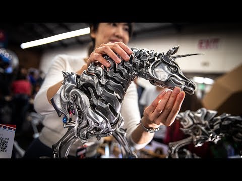 We were instantly captivated by these steel interactive sculptures by Roy Hung, who runs Perkunas Design Studio. His unicorn and beast sculptures are created out of hundreds of pieces of smelted steel, from 3D printed molds. We chat with Roy and his translator about what makes these articulating art pieces so special.